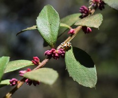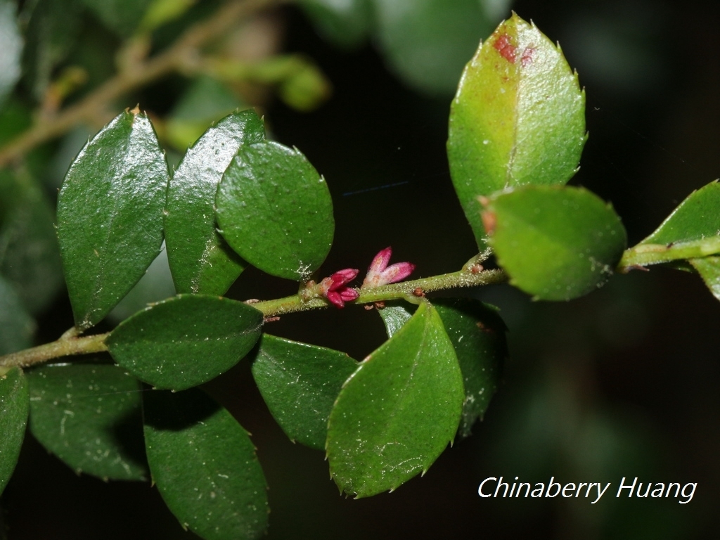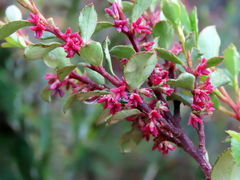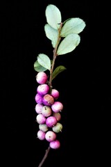 A shrub that can reach 1 to 2 meters in height. It has glossy leaves, pink flowers and blue to purple berries.