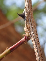 It has extremely hard, dense and attractive timber, and is only spared from intense exploitation because of its strongly twisted trunk which does not lend itself to long planks, and its tendency to develop heart rot. The bark is rough, dark grey and flaking, while the strong, paired hooked thorns are a formidable deterrent on young plants. Twigs which may vary in hairiness from densely puberulous to pubescent or tomentose. Due to its variability the species has been described under many names, some being listed below.
